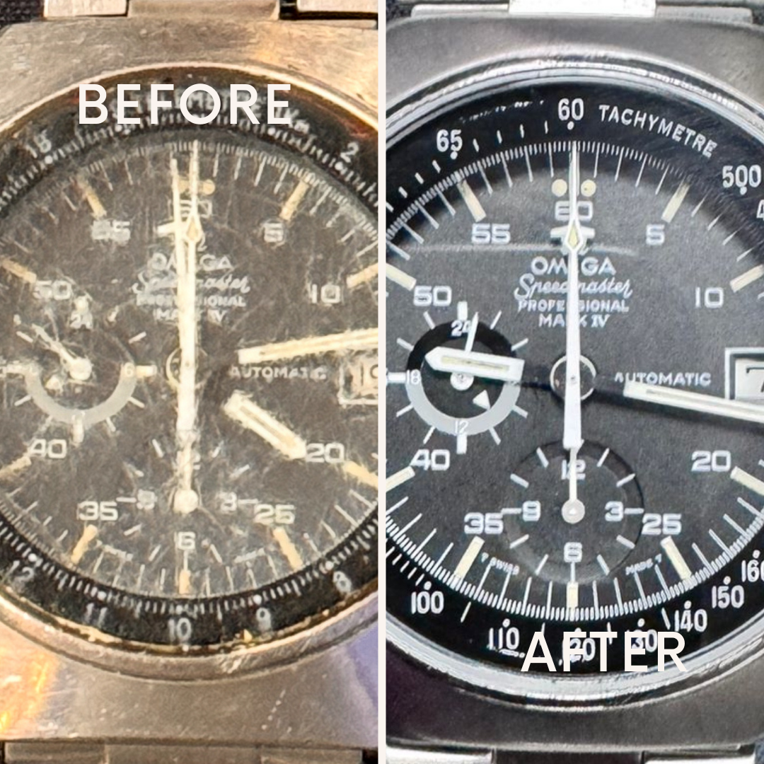 On the picture: Extremely scratched all over Omega Speedmaster IV before and after refurbishment.