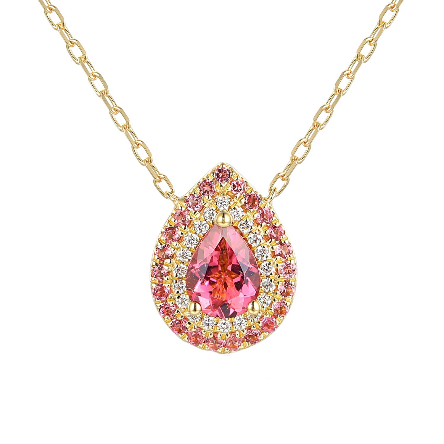 A radiant celebration of colour and refined design, this luxury coloured gemstone pendant features a luminous pear‑cut pink tourmaline centre that glows with soft, romantic hues. Framed by a double halo of shimmering white and pink diamonds, this piece brings depth, brilliance and elegance to every look.