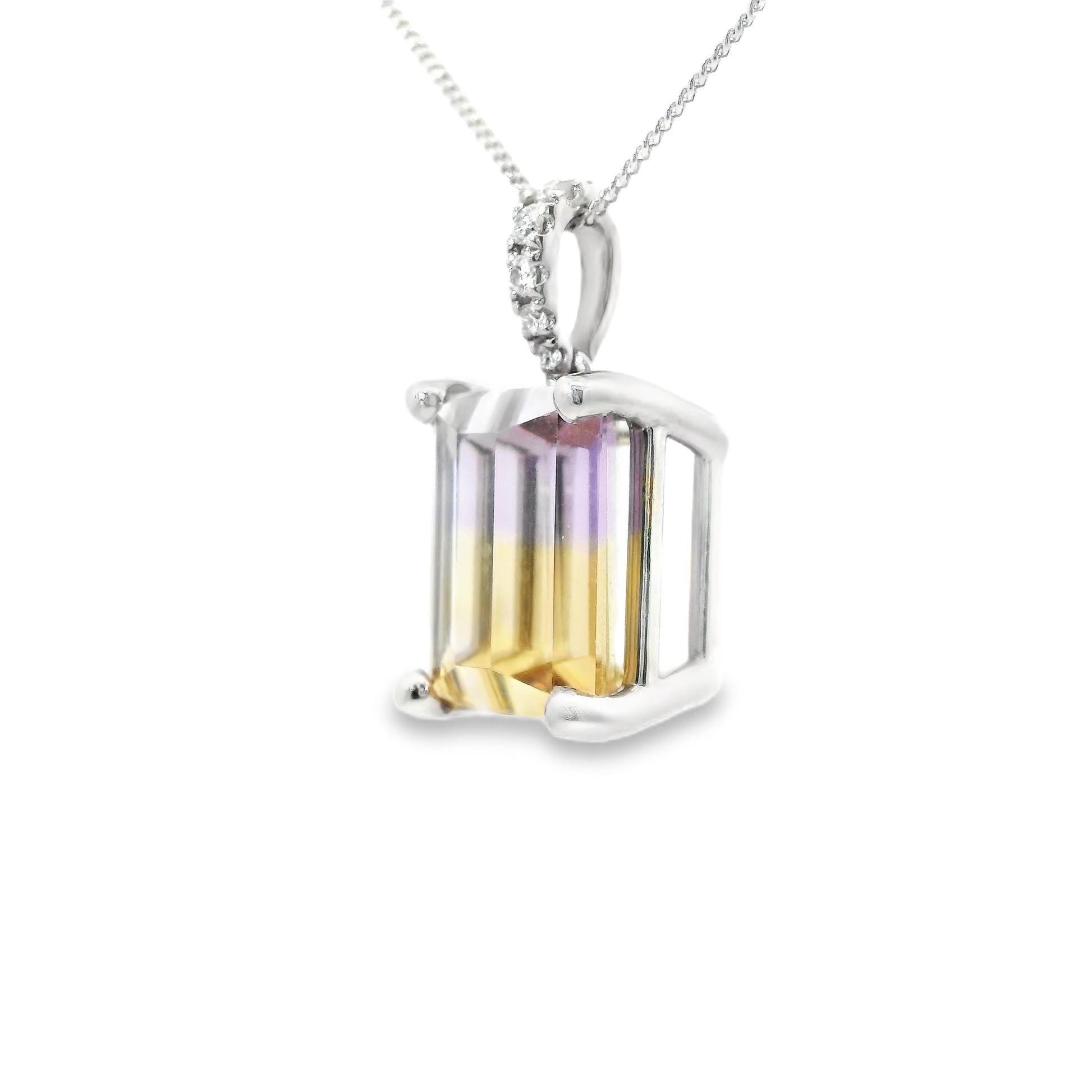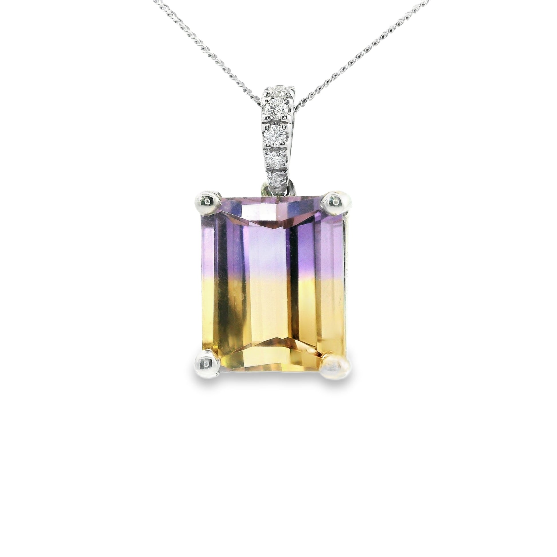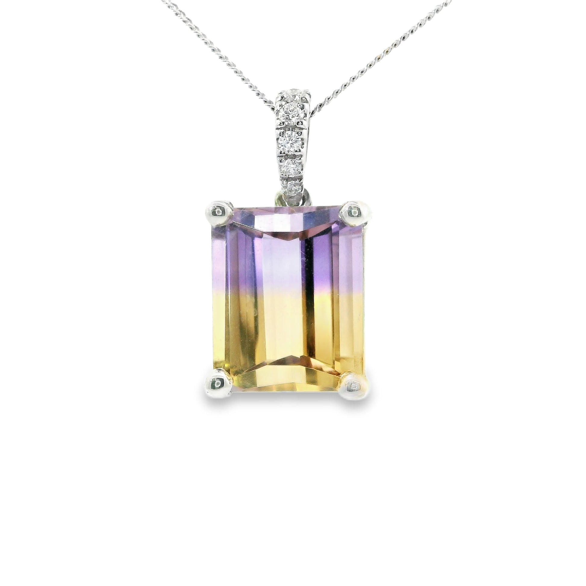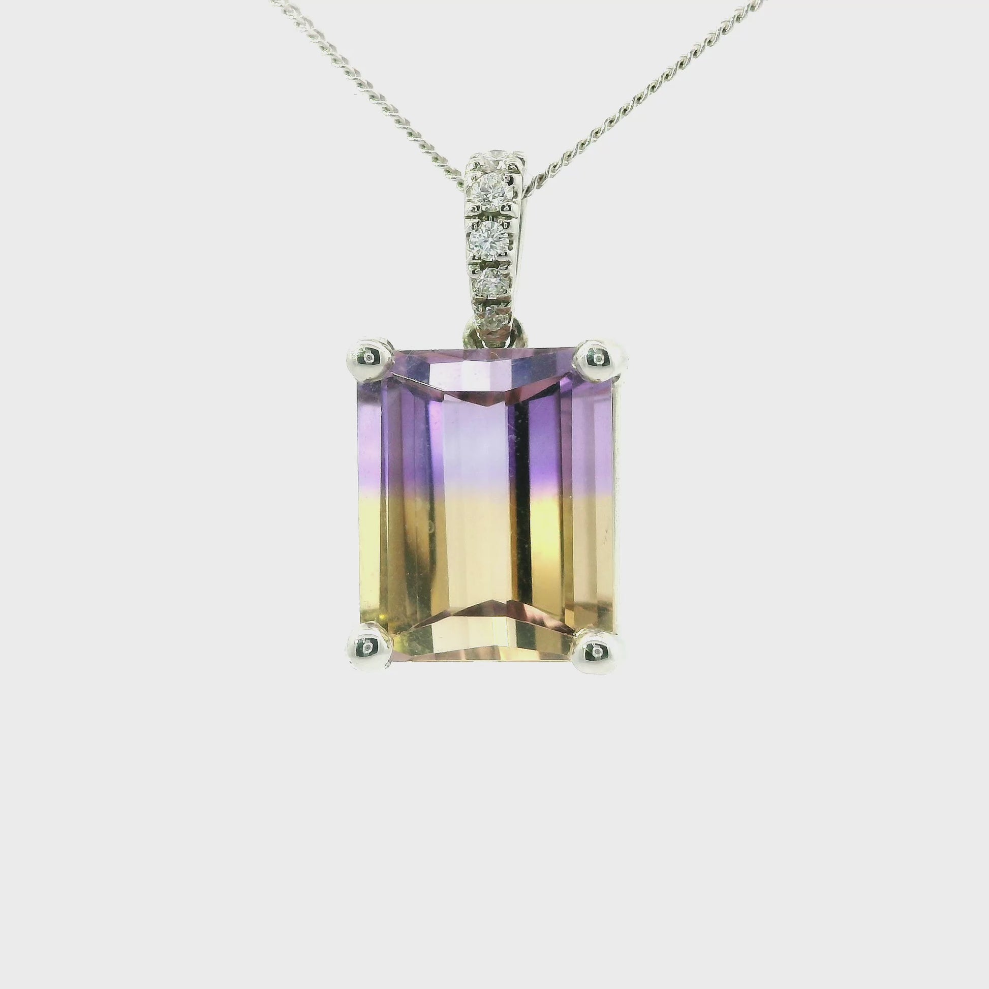Set in a finely crafted pendant, this 4.37 ct ametrine catches the light beautifully, shifting between soft purples and radiant golds depending on the angle. Elegant yet distinctive, this piece is perfect for those who appreciate the artistry of nature and the timeless allure of fine gemstones.