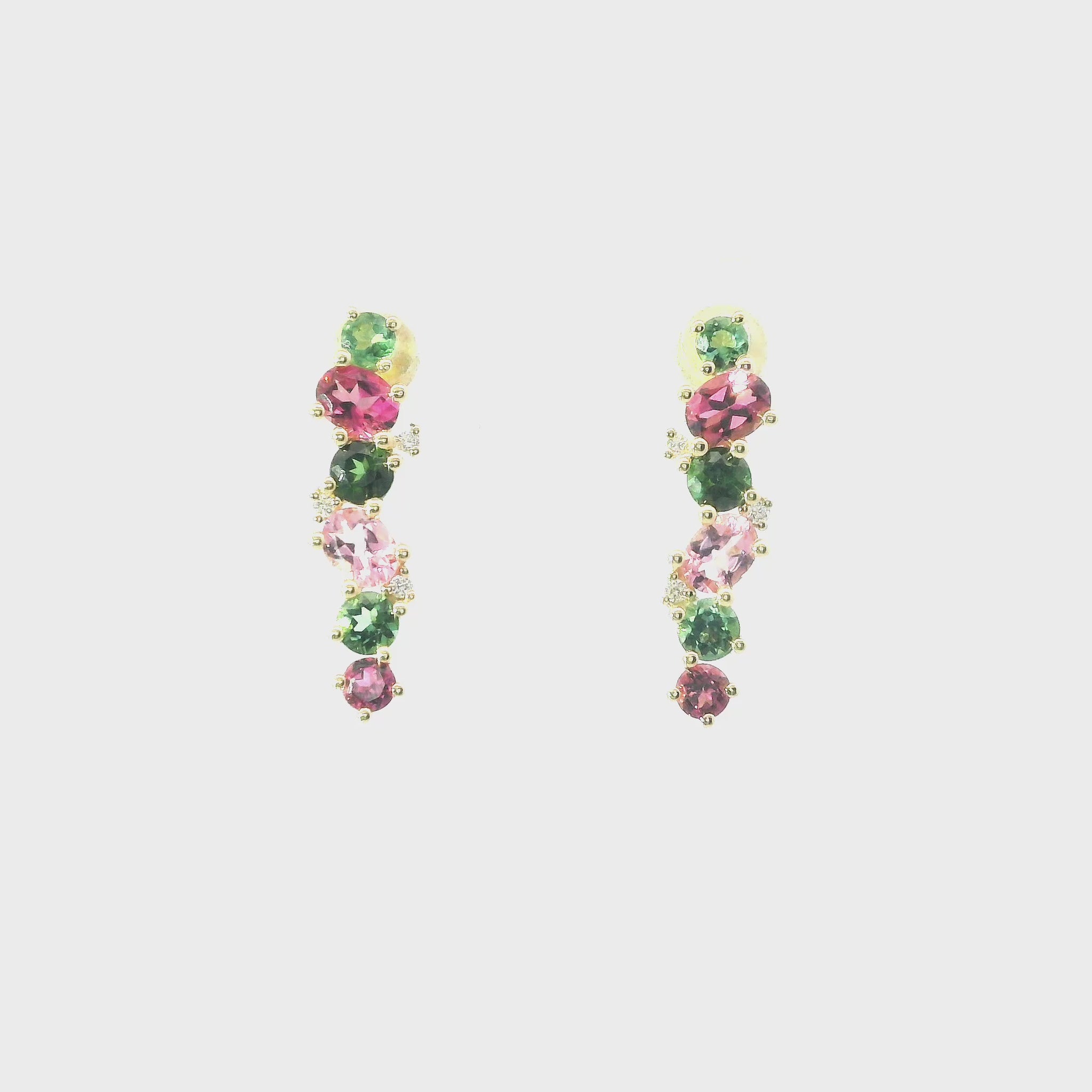 A vibrant celebration of colour and elegance, these 9ct yellow gold earrings feature an enchanting mix of green and pink tourmalines, symbolising harmony and love. Each gemstone is carefully set along a delicate curve, enhanced by the subtle sparkle of brilliant-cut diamonds for added radiance.