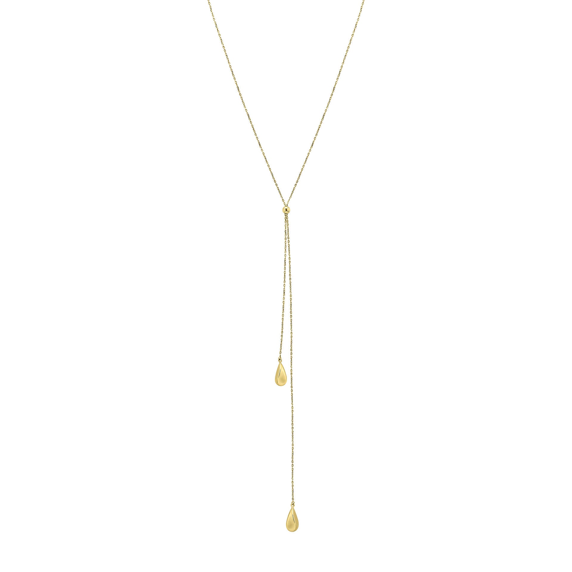 A modern take on a timeless classic, this lariat necklace is crafted in 9ct yellow gold with softly sculpted drops that offer a refined yet distinctive silhouette. Designed for effortless versatility, its elegant profile makes it the perfect choice for special occasions. Whether worn alone or styled with the matching bracelet, this necklace brings a touch of enduring sophistication to any look.