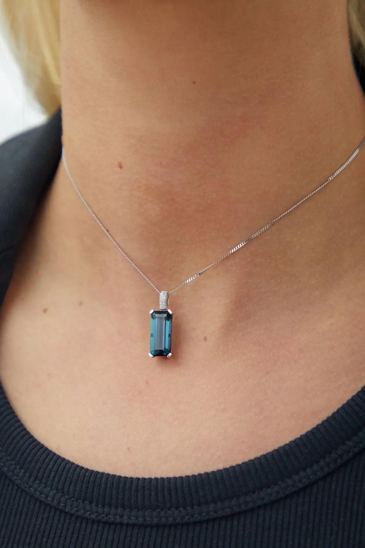 Infuse your collection with rich colour and refined sparkle with this luxury coloured gemstone necklace in polished 9ct white gold. At its heart sits a deep, mesmerising London blue topaz — a gemstone celebrated for its captivating, inky blue tones and luminous clarity — set alongside brilliant diamond accents that enhance its exquisite shimmer.