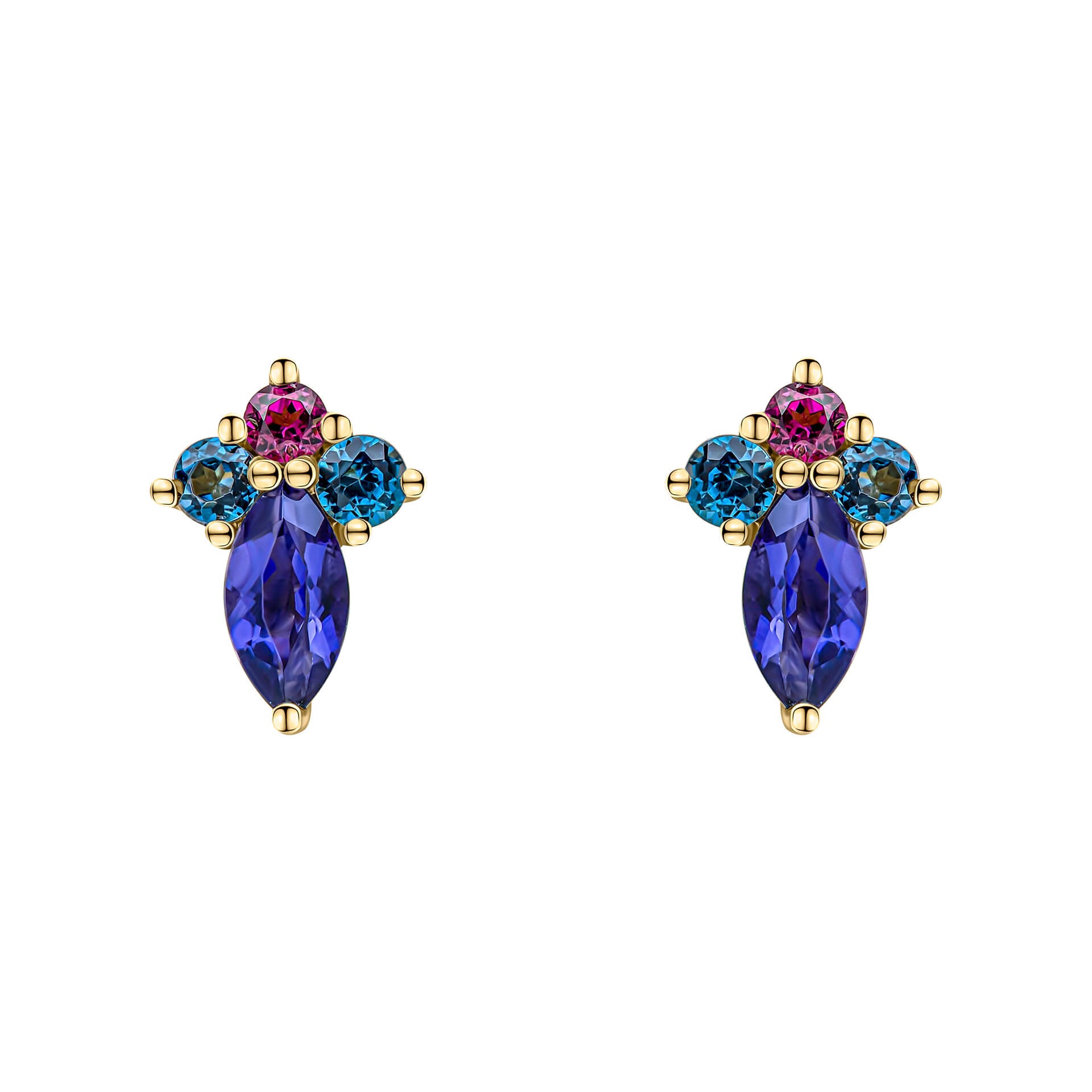 Crafted in 9ct yellow gold, these cluster stud earrings feature a stunning arrangement of semi-precious stones, including Iolite, London blue topaz, and rhodolite. Each stone is meticulously selected to evoke the vibrant and captivating colours of Barcelona's iconic stained glass, bringing a touch of the city's artistic spirit to your jewellery collection. Perfect for adding a sophisticated pop of colour to any outfit, these earrings embody the essence of modern elegance and timeless beauty, especially when paired with the matching pendant.