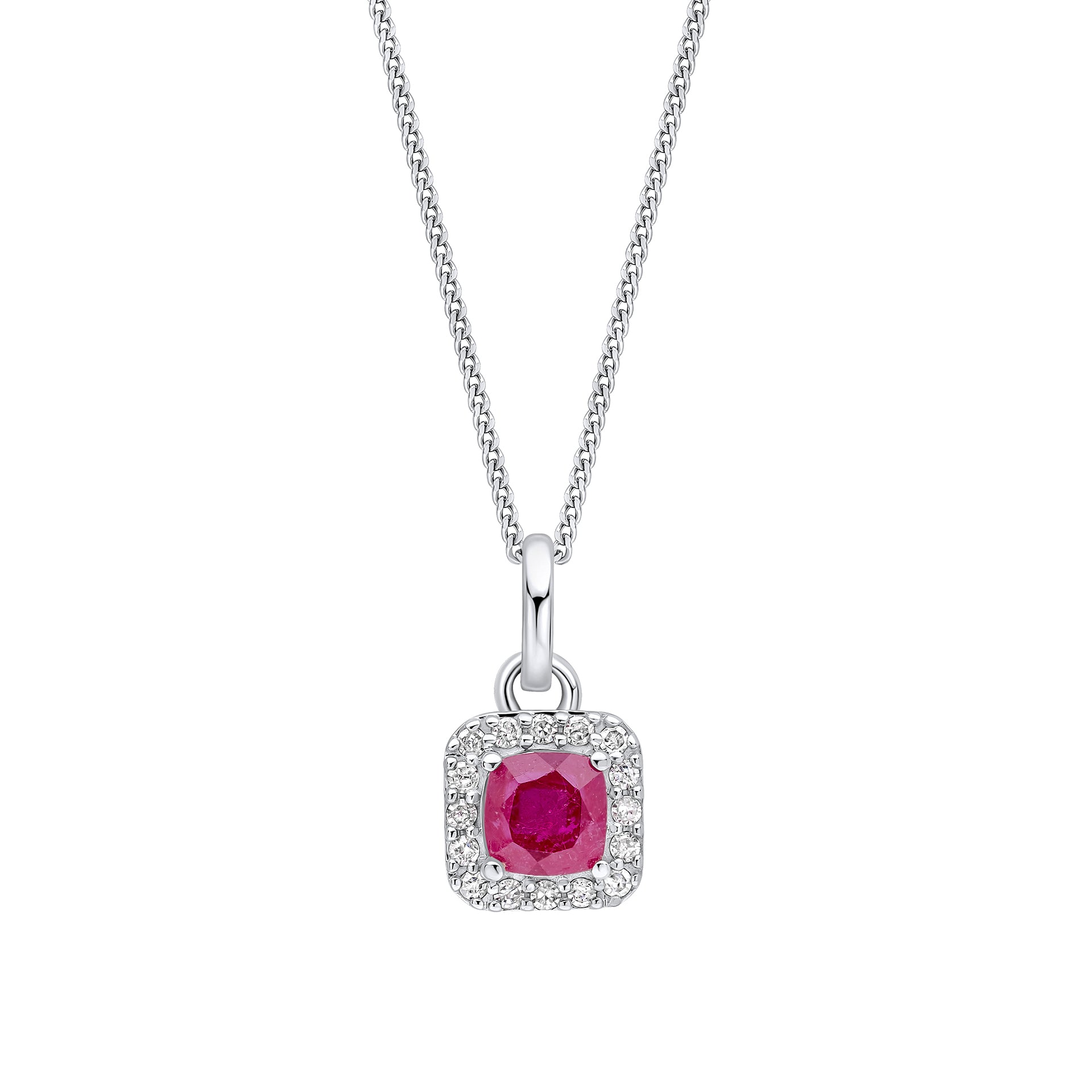 Channelling the glamour of the 1950s, this elegant pendant captures the enduring allure of vintage design. A vivid cushion-cut ruby forms the centrepiece, framed by a delicate halo of glittering diamonds, all set in radiant 9ct white gold. Offering timeless sophistication with a bold pop of colour, it brings a refined touch to both everyday wear and special occasions, especially when paired with the matching earrings.