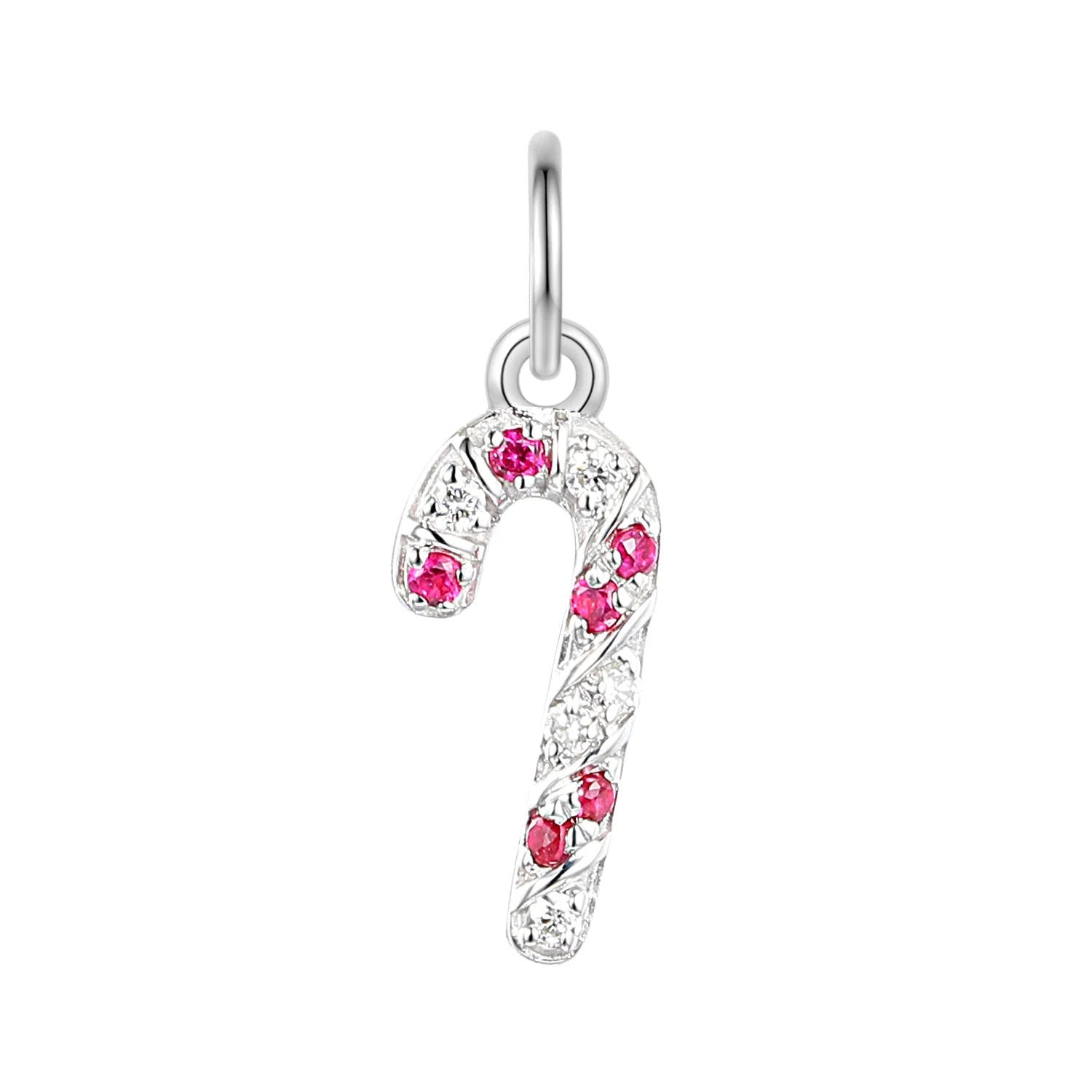 Diamond & ruby set candy cane charm with a loop to attach to a necklace or bracelet.