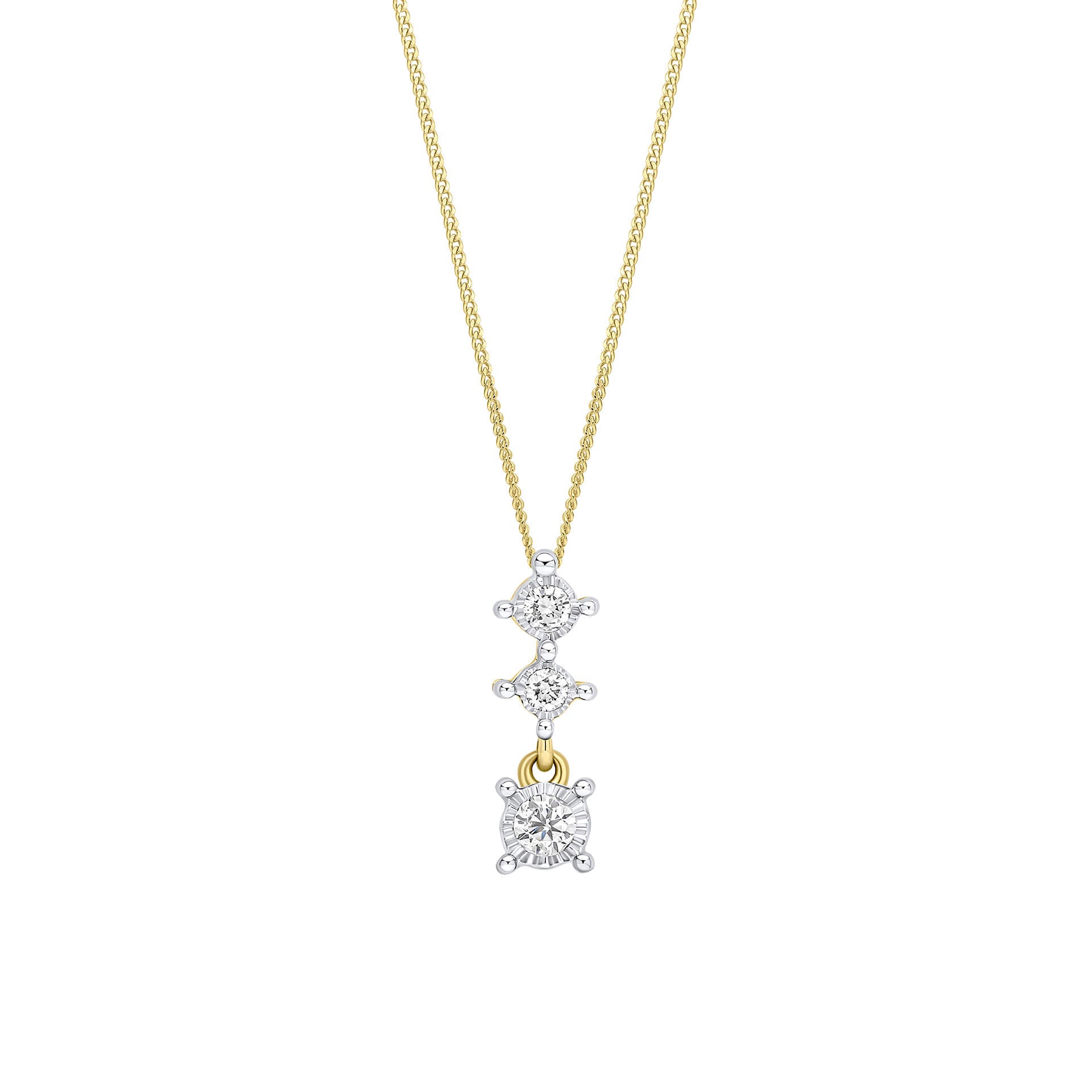 Evoking a sense of timeless grace, this drop pendant is a delicate tribute to the enduring beauty of jewellery across the ages. Crafted in 9ct gold, it features a trio of diamonds with illusion settings, adding to the understated yet radiant appeal. Designed for effortless elegance, this pendant is perfect for everyday wear or refined occasions. Pair with the matching earrings for a beautifully coordinated look.