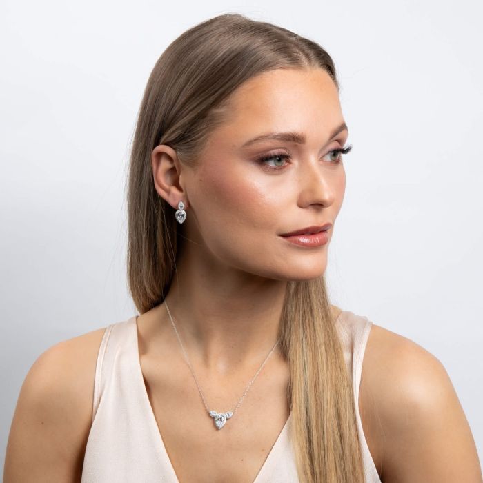 Make a dazzling statement with these stunning drop earrings, designed to exude glamour and elegance with every movement. Featuring two teardrop shaped Diamonfire zirconia stones, each encased in a sparkling halo, these earrings catch the light from every angle. Crafted from sterling silver with a triple plating of platinum, palladium, and rhodium, these earrings offer a radiant finish that lasts. The fluid drop design enhances their brilliance, making them the perfect choice for black-tie events, weddings, or any occasion where only the most sophisticated sparkle will do, especially when worn with the matching necklace.