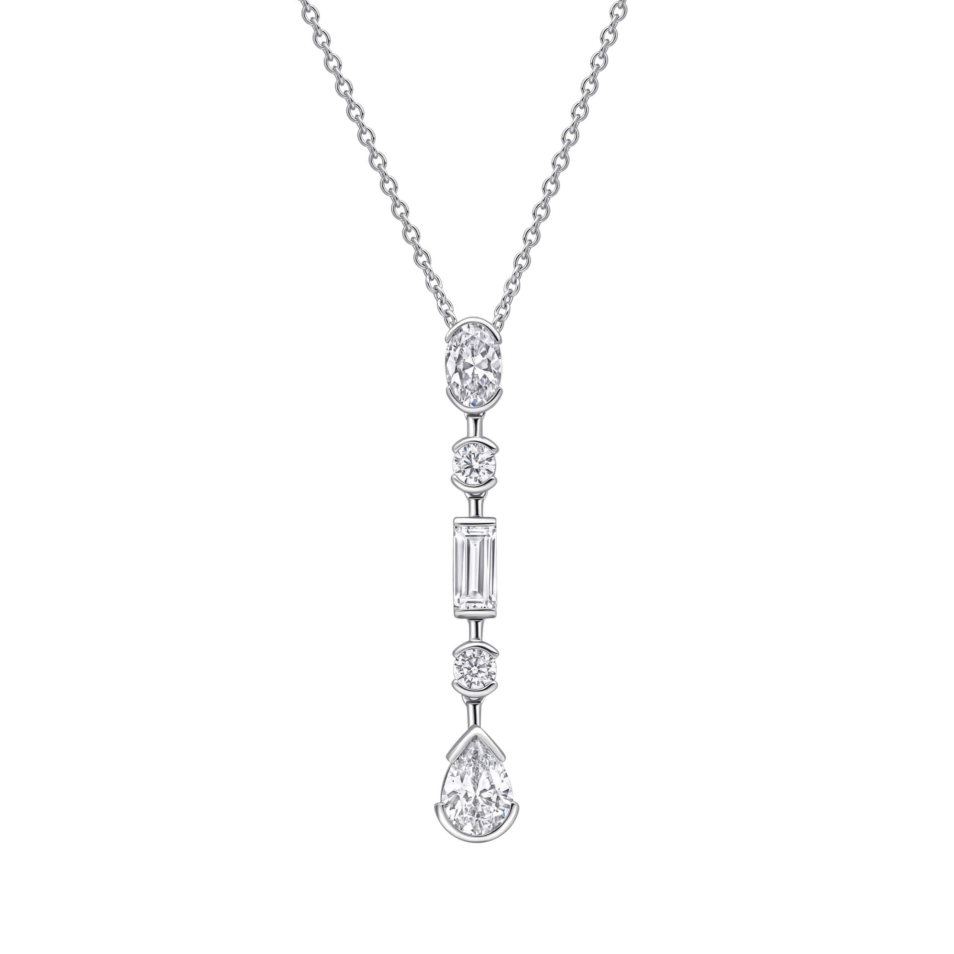 A refined expression of modern glamour, this pendant features a linear design accented with brilliantly cut Diamonfire zirconia stones. Crafted in sterling silver and finished with a luxurious triple plating of palladium, platinum and rhodium, it delivers exceptional sparkle and refined durability. The elongated silhouette creates elegant visual movement along the neckline, making it a sophisticated choice for special occasions. Worn alone or paired with the matching drop earrings, it beautifully elevates evening and formal looks.