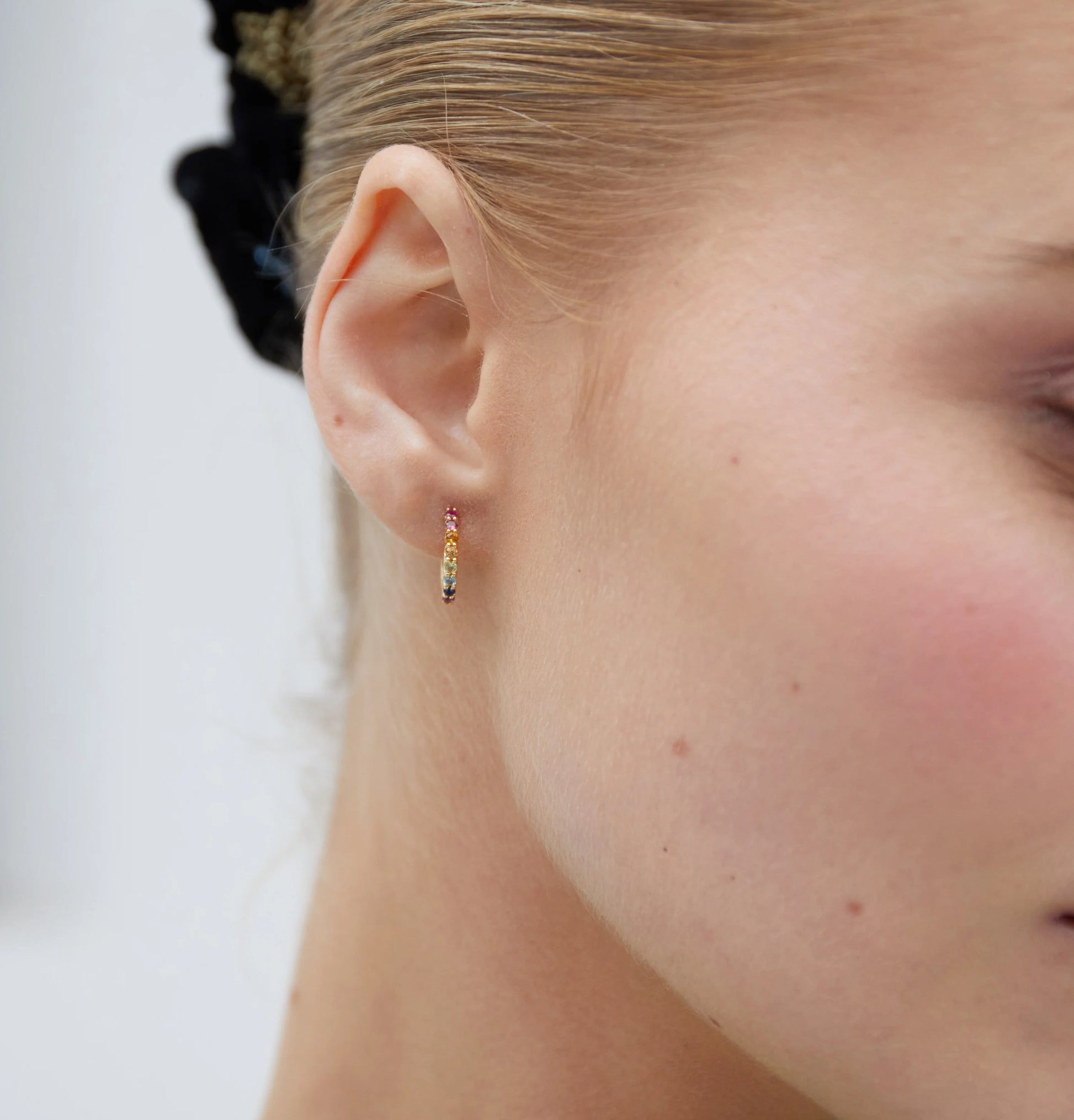 A radiant fusion of colour and sophistication, these luxury gemstone gold hoops bring refined sparkle and vibrant hues to everyday elegance. Expertly crafted with a claw-set array of gemstones halfway around each hoop, these earrings offer harmonious brilliance and eye-catching detail that complements both casual and elevated looks.