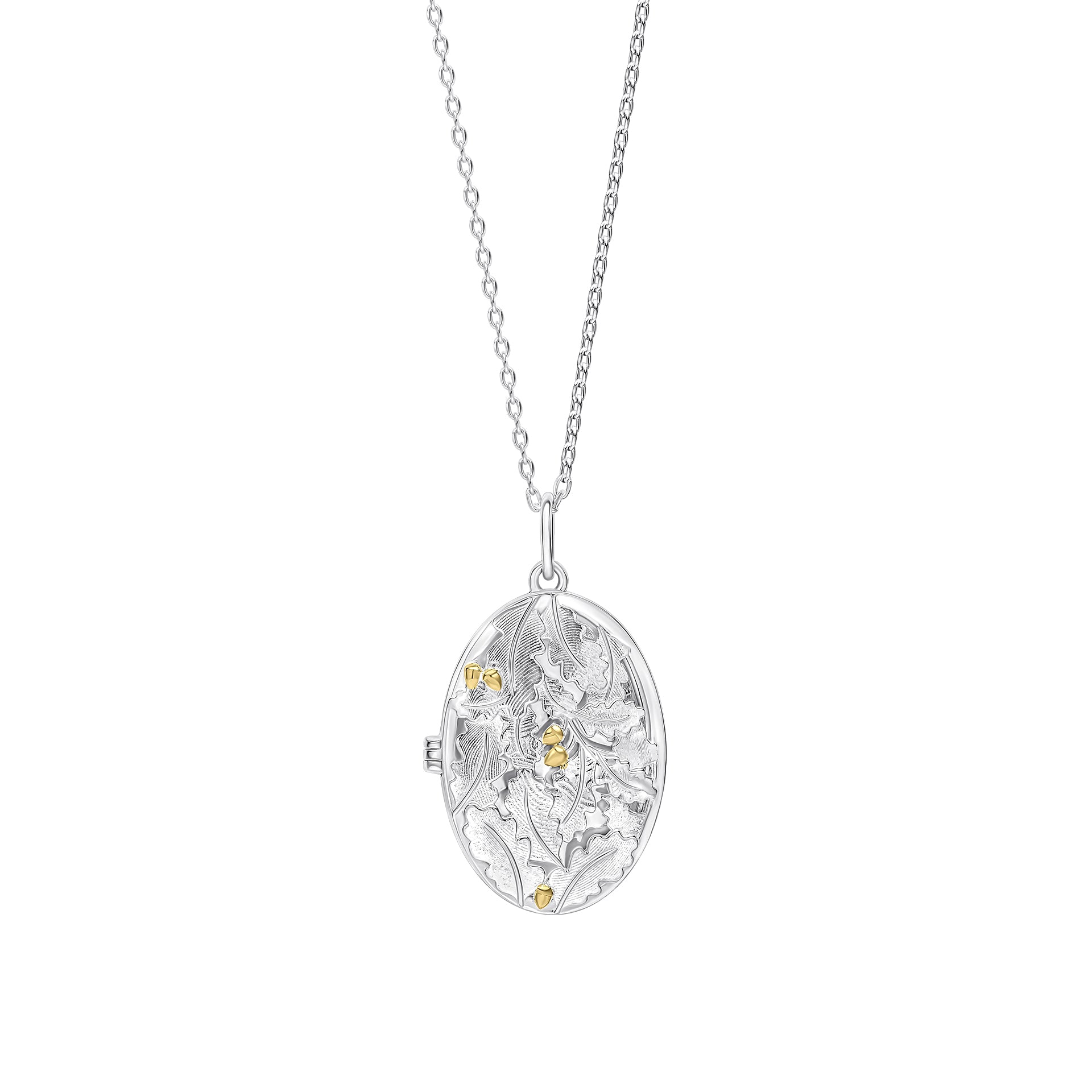 Inspired by the autumnal Laura Ashley Broadoak print, this locket necklace celebrates the season’s quiet beauty with a delicate oak leaf and acorn design. Crafted in recycled sterling silver with yellow gold plated accents, it captures the warmth and richness of autumn while reflecting a deeper sense of heritage and romance. The oval locket opens to reveal space for an engraving inside, with further room for personalisation on the reverse, making it a thoughtful keepsake to hold close. Poetic and timeless, it can be worn alone or paired with the matching hoop earrings for a coordinated look.