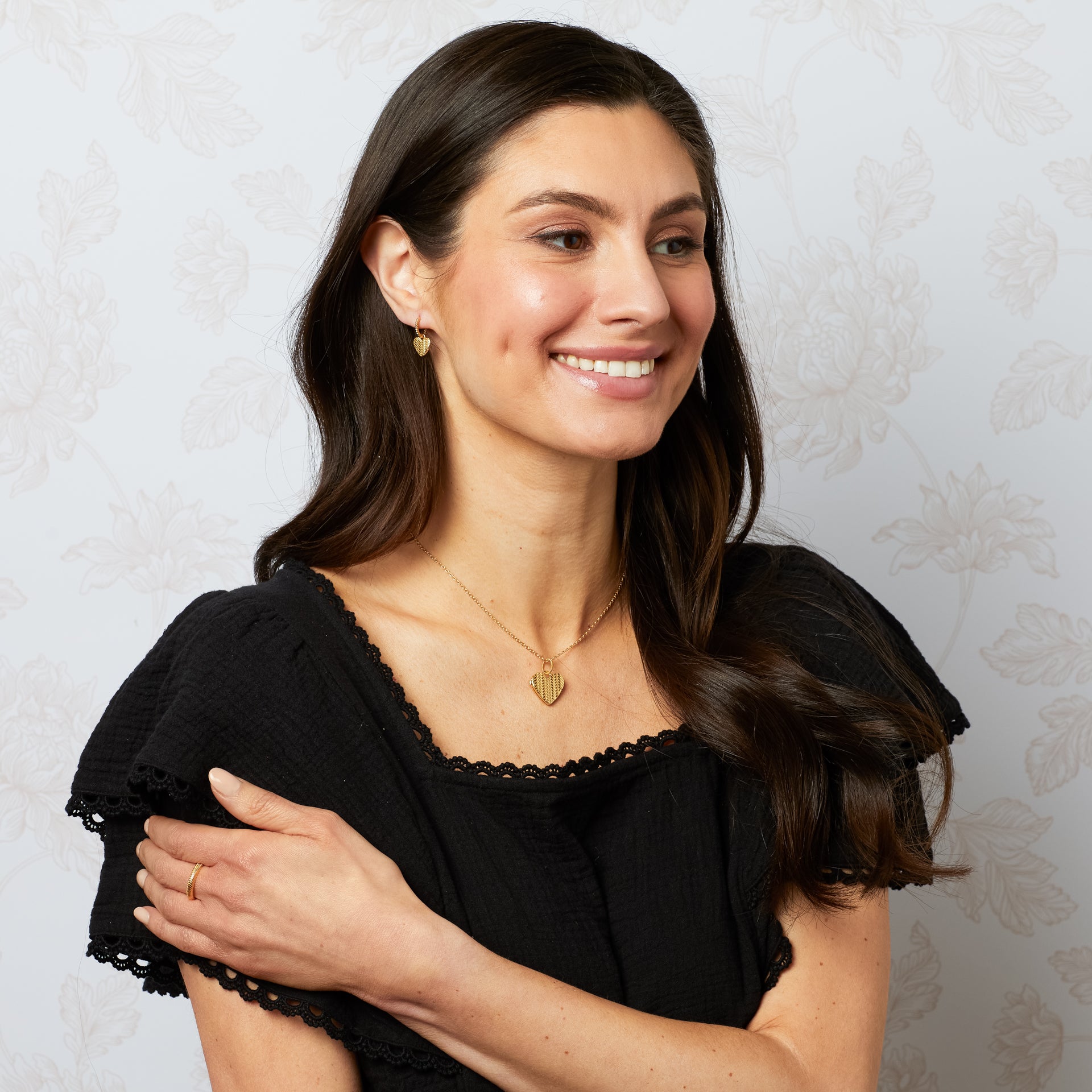A romantic nod to countryside picnics and gentle summer days, the design of these earrings takes inspiration from the basket weave texture of the beautifully floral Megan print by Laura Ashley. The softly textured heart reflects the woven charm of a traditional picnic basket, while twisted hoops add a vintage inspired finish. Worn alone or paired with the matching ring and locket, these earrings capture the quiet joy of nature and the elegance of timeless design.