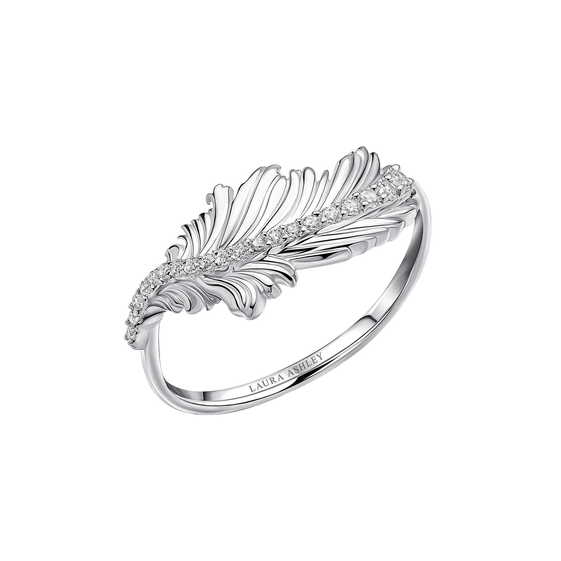 Inspired by the luxurious Laura Ashley Plume print, with its delicate feather motifs, this ring captures the light, airy beauty of the design in recycled sterling silver. The feather is finely detailed with flowing lines that echo the prints graceful movement, while a row of sparkling cubic zirconia stones adds a touch of radiance. Romantic yet contemporary, it reflects the ethereal femininity and grounded elegance of the autumn season, perfect worn alone or styled with the matching earrings and necklace for a coordinated look.