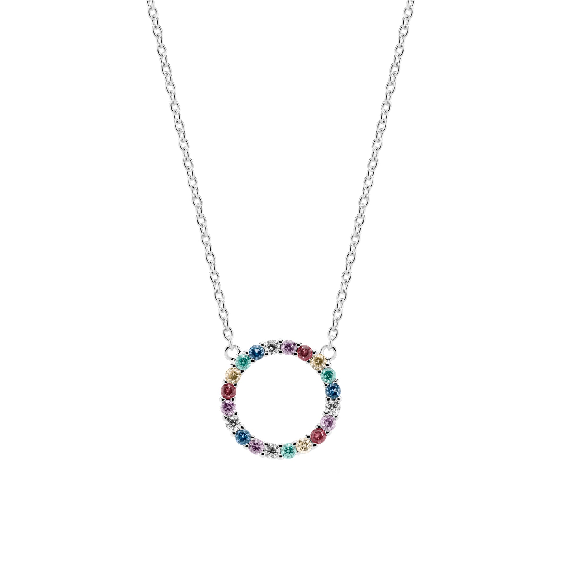 Necklace made of 18 carat gold plated 925 Sterling silver, polished surface and facet cut multicoloured zirconia.