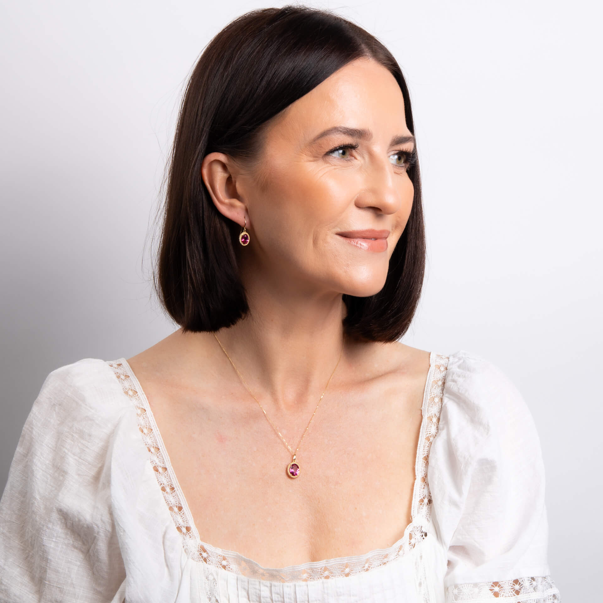 Radiating with bold femininity and vintage charm, this pendant blends historical inspiration with striking modernity. Crafted in 9ct gold, it features a vivid pink topaz, symbolising confidence and individuality, set within a delicately stippled frame inspired by 18th-century jewellery. The intricate detailing and vibrant hue create an elegant yet contemporary look, making this pendant a timeless expression of personal style. Pair with the matching earrings for an effortlessly elegant ensemble.