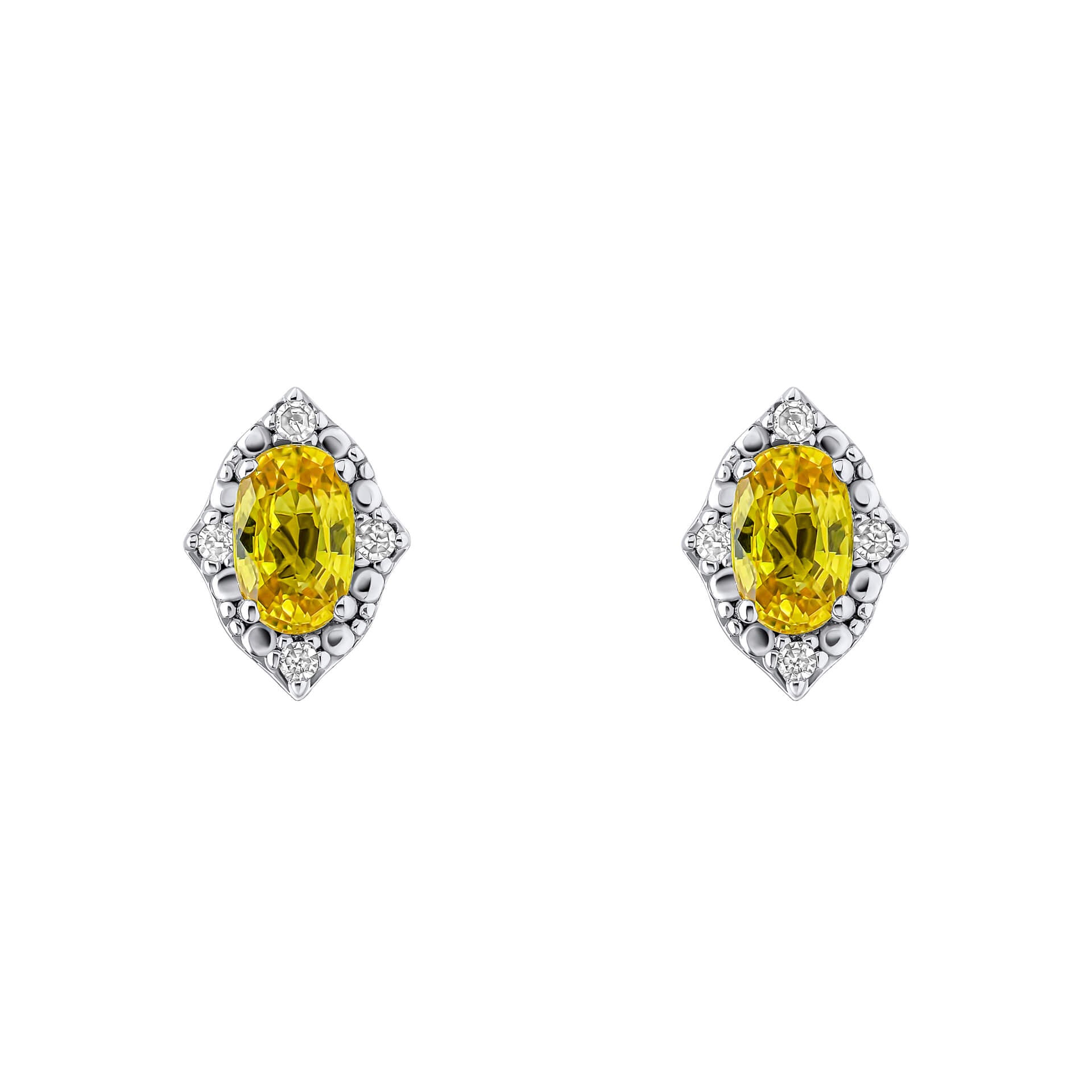 Crafted from 9ct white gold, these striking earrings showcase a vibrant oval-shaped yellow sapphire at their centre, radiating a rich and captivating hue. The sapphire is elegantly framed by four dazzling diamonds, adding a touch of sparkling brilliance to the design. The white gold setting features intricate texturing between the diamonds, enhancing the overall radiance and ensuring these earrings shimmer beautifully in any light. Perfect for both everyday wear and special occasions, they are a must-have addition to any jewellery collection, especially when paired with the matching pendant.