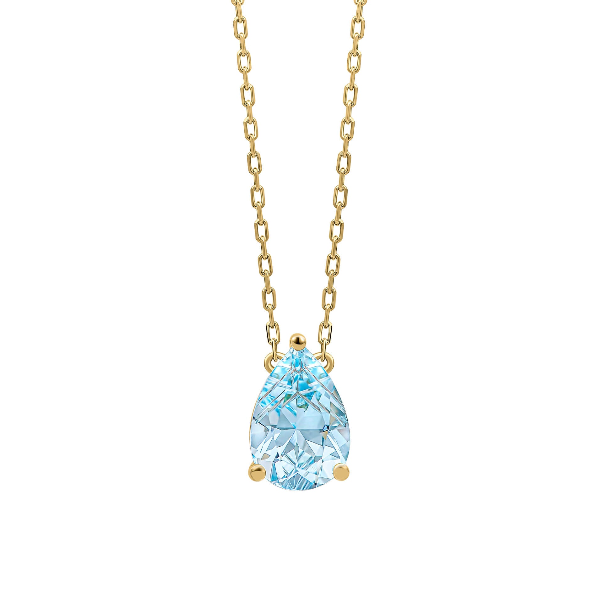 Indulge in luxury with this necklace, inspired by the sleek lines of modernist architecture. Crafted in 9ct yellow gold, this pendant showcases a pear-shaped blue topaz stone, delicately held in a claw setting. The distinctive fancy cut of the topaz creates an entrancing display of light, mirroring the dynamic interplay of lines found in modern architecture. Complete your ensemble with effortless elegance by pairing this pendant with the matching stud earrings, seamlessly blending sophistication and style.