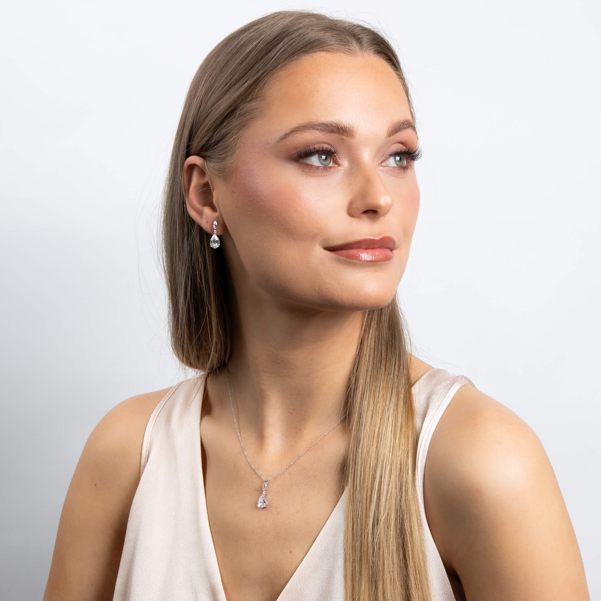 For those who love to make an entrance, this pendant radiates elegance and high-glamour sophistication. Crafted in sterling silver with a luxurious triple plating of platinum, palladium, and rhodium, it offers a luminous finish designed to last. This pendant is set with stunning Diamonfire zirconia, featuring a marquise-cut stone leading to a delicate round accent and a striking teardrop centrepiece that catches the light with every movement. Perfect for black-tie events, weddings, or any occasion where only timeless sparkle will do, this pendant is the ultimate statement of refined glamour and can be paired with the matching earrings for a truly unforgettable look.