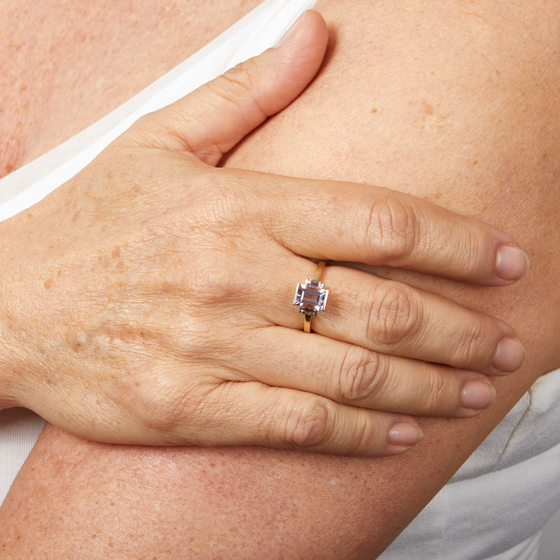 This stunning ring is crafted in luxurious 9ct yellow gold and features a captivating trilogy of amethyst stones that radiate sophistication and charm. The centrepiece of this ring, a large, baguette-cut amethyst, renowned for its deep, enchanting purple hue and clarity, is flanked by two smaller, baguette-cut amethysts. This trilogy arrangement creates a harmonious balance, drawing inspiration from the forms of contemporary architecture and artwork. Perfect for any occasion, this ring will add a touch of refined glamour to your ensemble, whether you're dressing up for a special event or looking to enhance your everyday look.