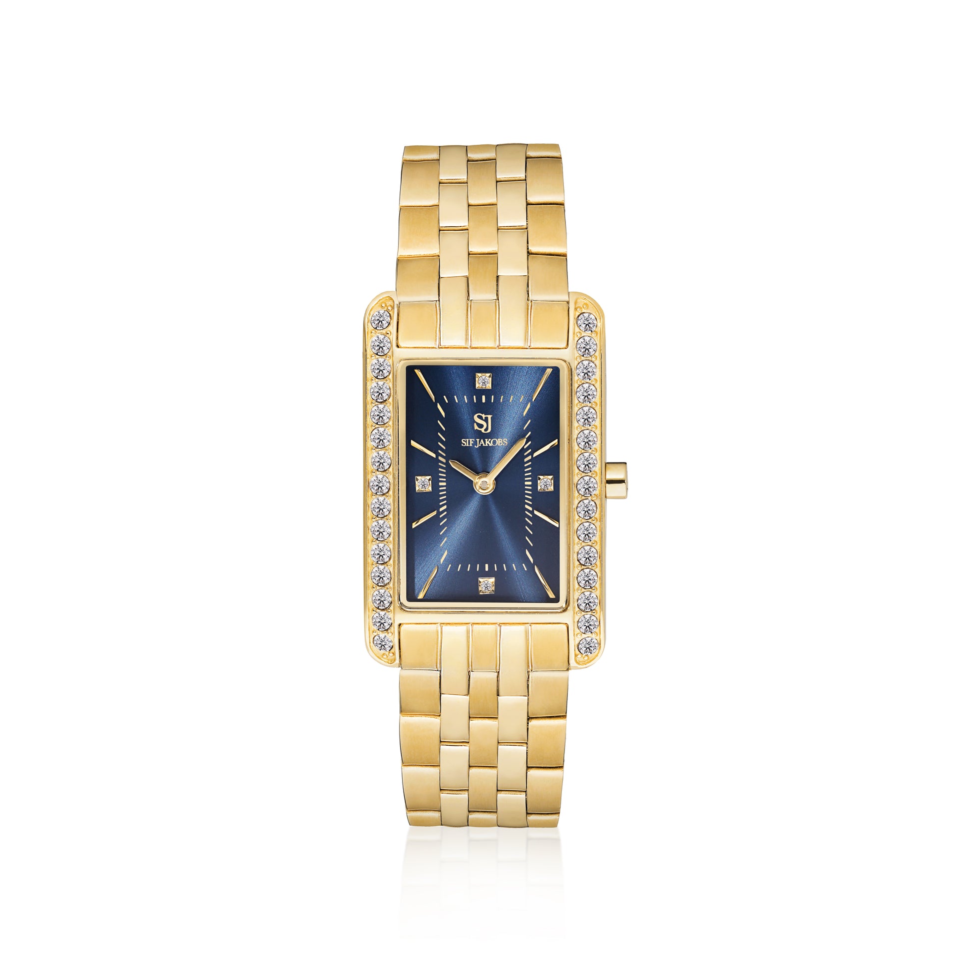 Discover the Martina Gold Plated Watch with Blue Dial — a refined timepiece crafted from 18K gold plated stainless steel with polished and brushed finishes for a premium look. The striking dark blue sunray dial is beautifully contrasted by white zirconia accents and protected by durable sapphire glass, while the reliable Miyota movement ensures accurate timekeeping. With 30 m water resistance, this elegant watch is perfect for everyday wear or special occasions, adding a sophisticated touch to any outfit.