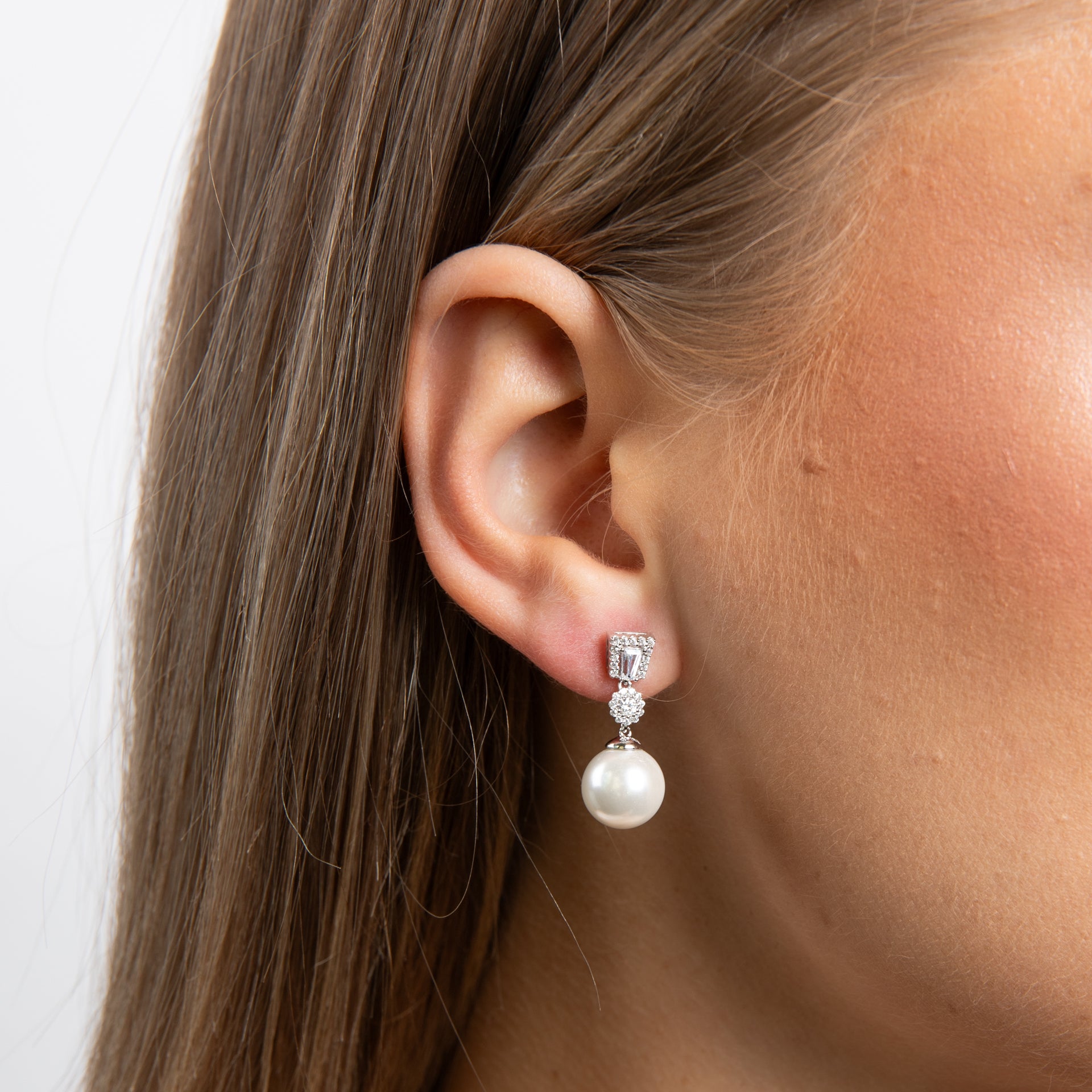 An ode to elegance, these drop earrings are the perfect finishing touch for any glamorous occasion. Crafted from sterling silver with a triple plating of platinum, palladium, and rhodium, they feature dazzling Diamonfire zirconia stones that cascade into a lustrous shell pearl drop, exuding refined sparkle and sophistication. Whether worn to a candlelit dinner, a gala event, or a special celebration, these earrings bring effortless glamour, elevating any look—especially when paired with the matching pendant.